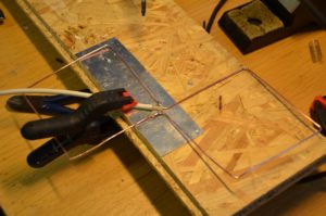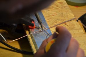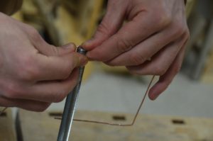 Dann wird der Draht acht mal um 90° gebogen. Für das Biegen eignen sich Tischkanten oder wie in Benedikts Fall eine Gewindestange. Mit einem Hammer können die Kannten noch genauer gearbeitet werden.