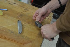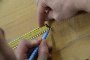 Falls der Draht noch etwas krumm ist, kann er durch das Rollen zwischen Tisch und einem geraden Brett geglättet werden. Anschließend muss die Drahtlänge durch acht geteilt und die Quadratkanten aufgemalt werden.